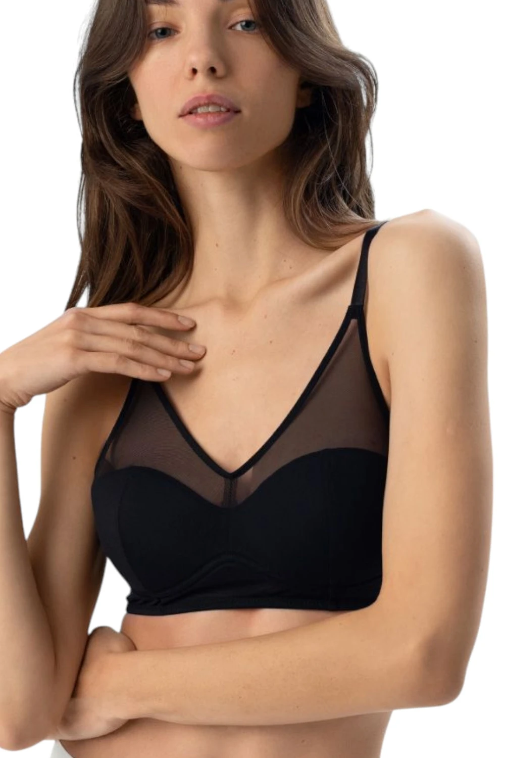Неймовірно комфортний та стильний напівм'який бюстгальтер-топ з тонкими поролоновими вшитими чашками, що м'яко, але натурально підтримує груди. Бюст стильно декорований сіткою у формі майки/топу, що є елементом дизайну та додаткової фіксації.