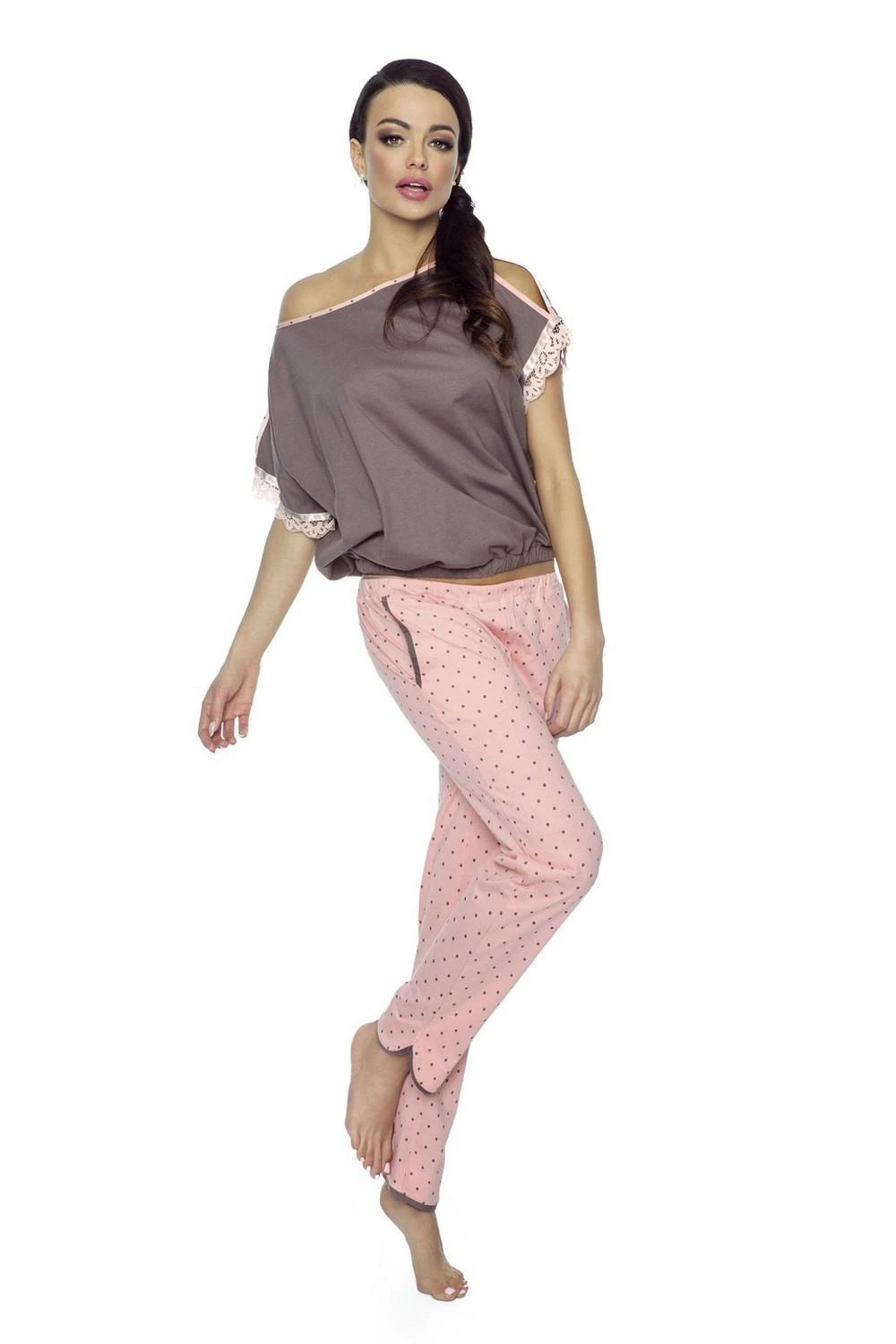 - Брюки длинные, украшены мелким горошком.