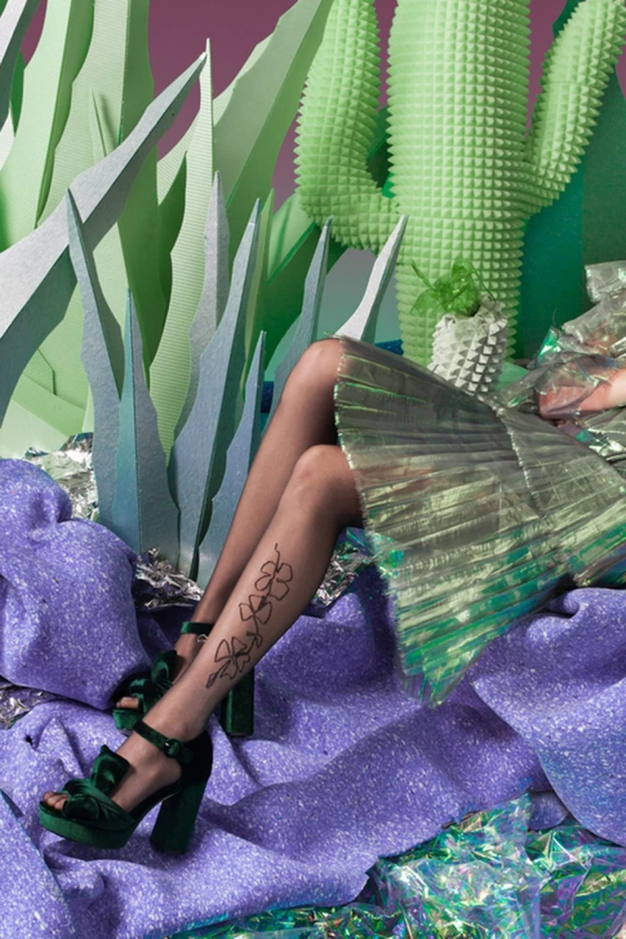 - Украшены интересным цветочным принтом книзу колготки.