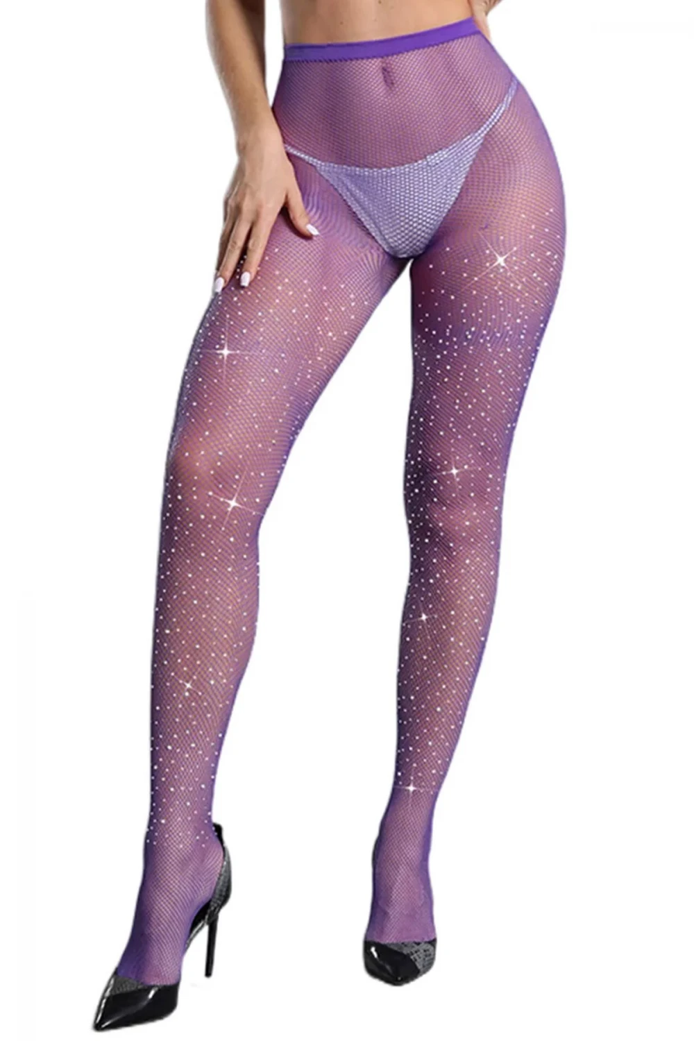 Эксклюзивные бесшовные колготки в сетку украшены небольшими сверкающими кристаллами в переплетении нитей.
