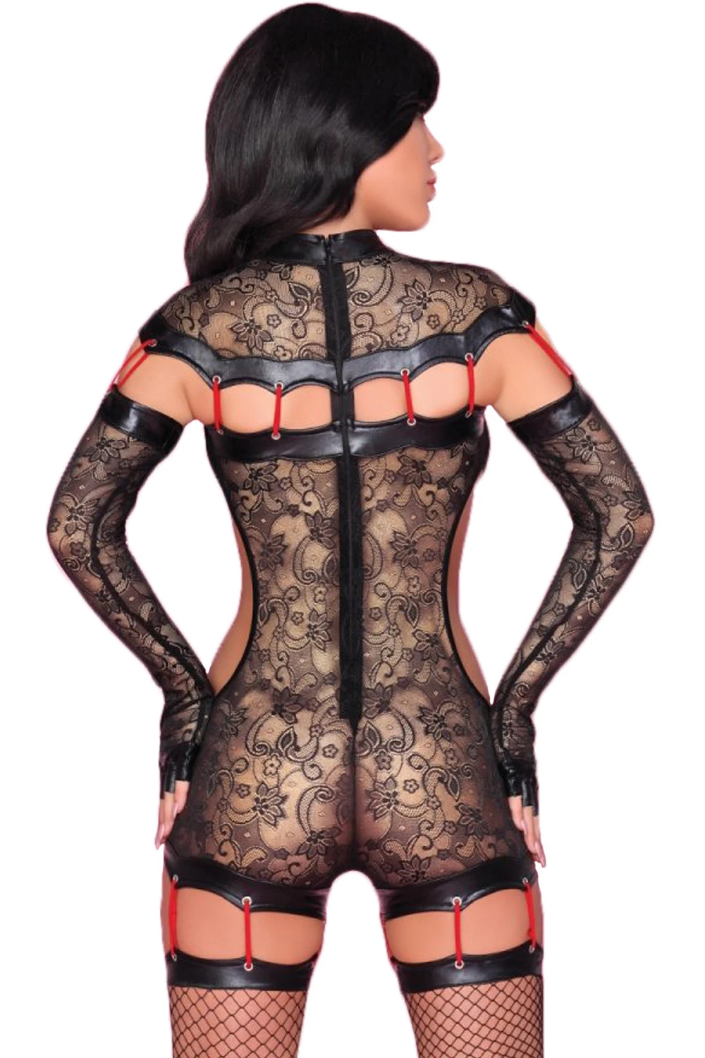 - Выполнен из мягкого кружева и латексных вставок.